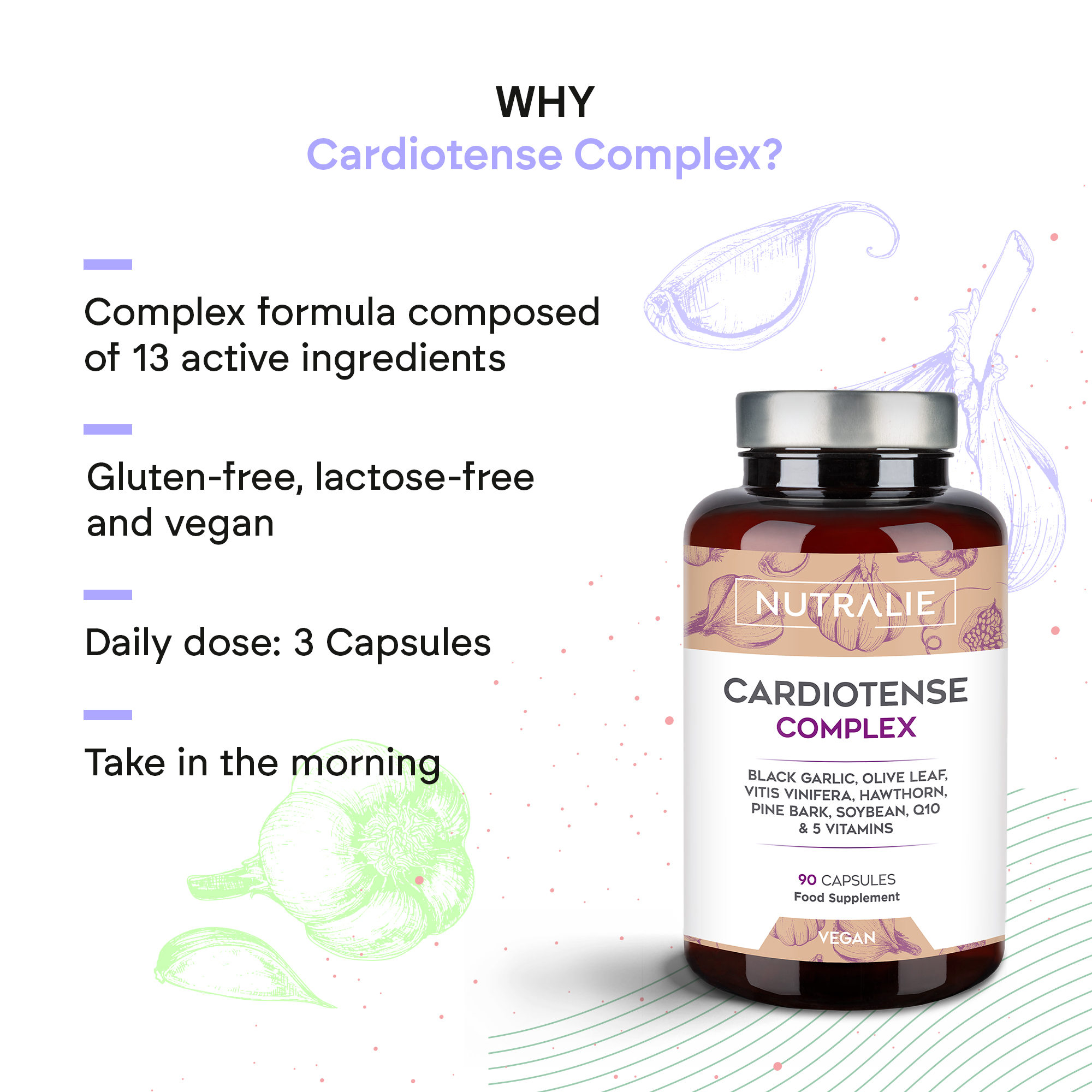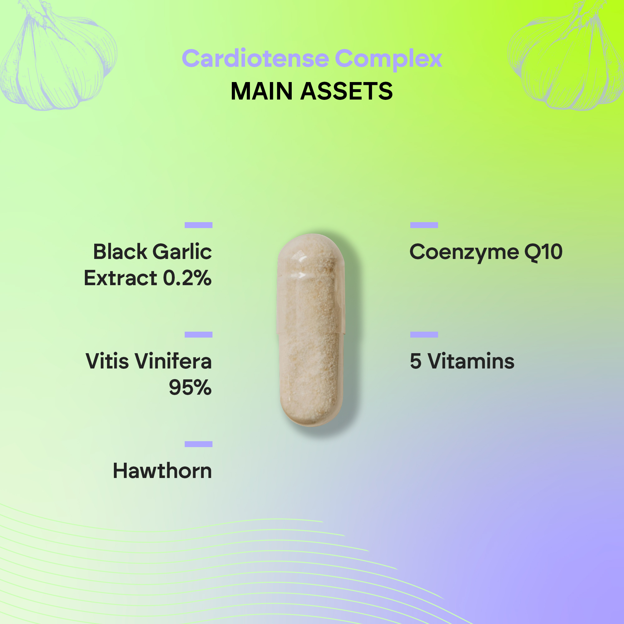 Black garlic bulb dry extract (Allium sativum L.) 3% polyphenols and 0.1% cysteine, bulking agent (microcrystalline cellulose), glazing agent (hydroxypropylmethylcellulose), olive leaves dry extract (Olea europaea L.) 20% oleuropein, black garlic bulb dry extract (Allium sativum L.) 1% S-allylcysteine, grape seeds dry extract (Vitis vinifera L.) 95% proanthocyanidins, hawthorn leaves dry extract (Crataegus oxyacantha auct.) 2% vitexin, maritime pine bark dry extract (Pinus pinaster Ait.) 95% proanthocyanidins, fermented soybean extract, anti-caking agent (magnesium salts of fatty acids), coenzyme Q10, thiamine (thiamine hydrochloride), riboflavin ( riboflavin), vitamin B6 (pyridoxine hydrochloride), folic acid (pteroylmonoglutamic acid), vitamin B12 (methylcobalamin).
