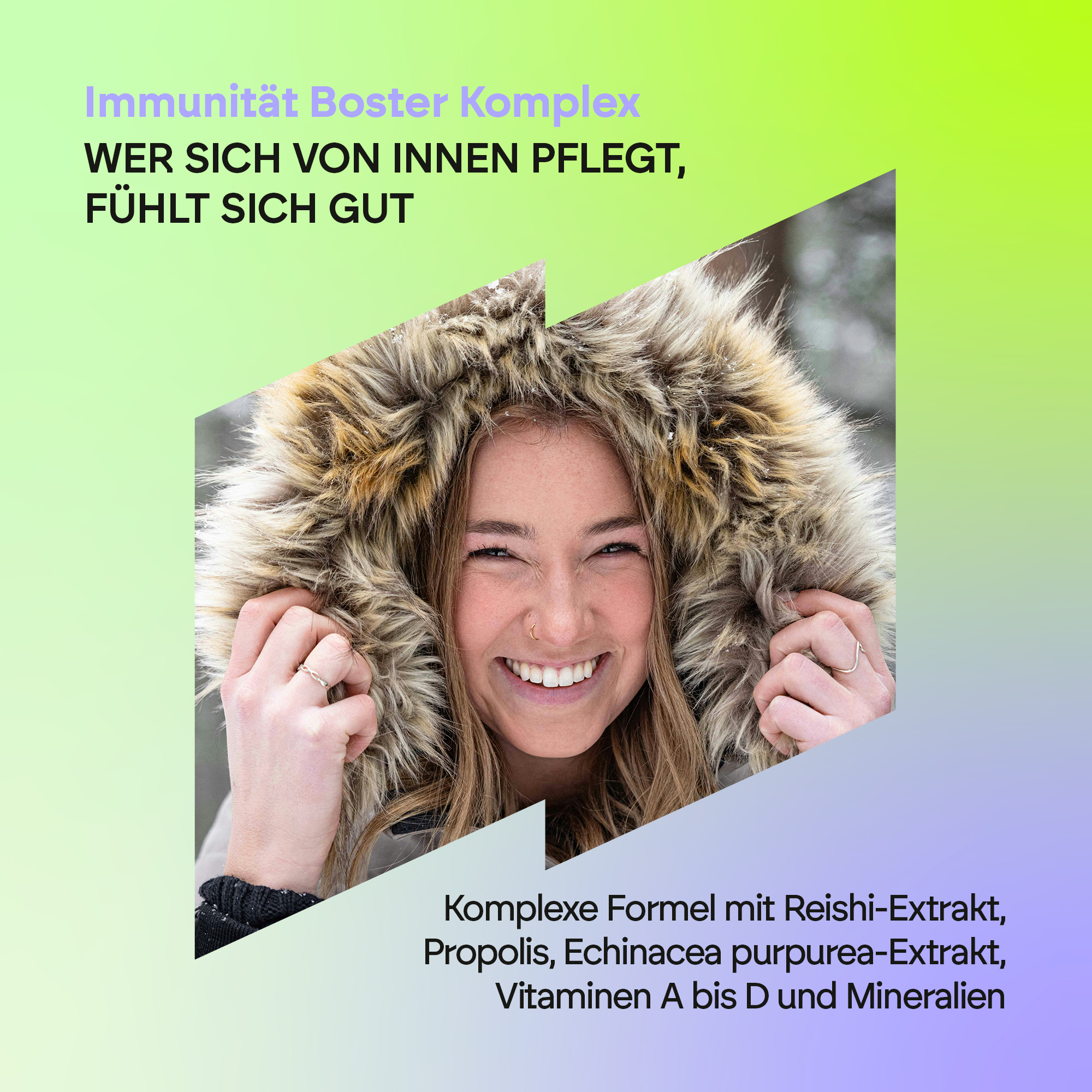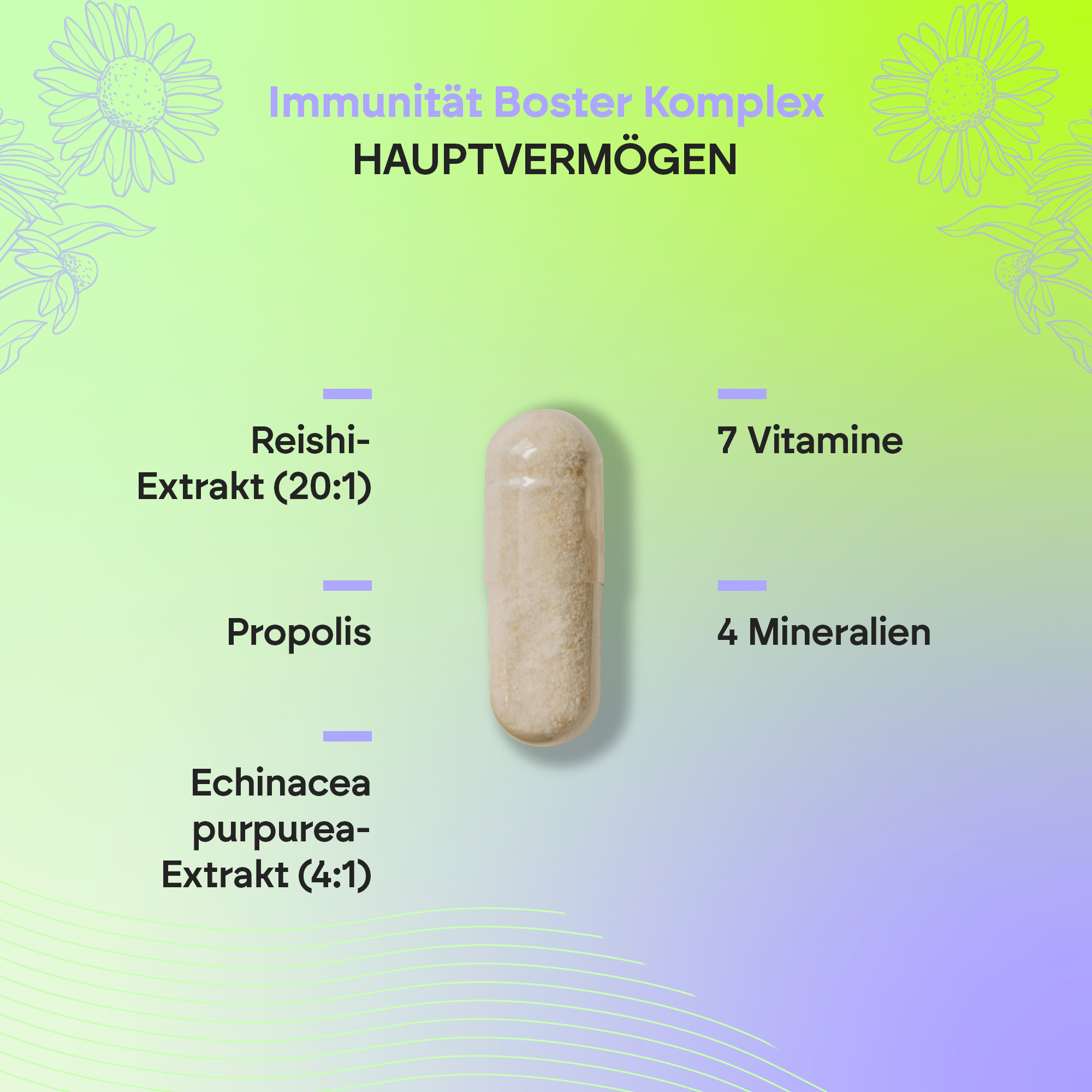 Füllstoff (mikrokristalline Cellulose), L-Ascorbinsäure (Vitamin C), Echinacea-Trockenextrakt (Echinacea purpurea), capsule (Überzugsmittel: Hydroxypropylmethylcellulose), Reishi-Pilz-Trockenextrakt (Ganoderma lucidum) (50 % Polysaccharide), Propolisharz-Trockenextrakt (18 % Flavonoide), Zinkbisglycinat, Eisensulfat, L-Selenomethionin,trennmitteln (Magnesiumstearat und Siliciumdioxid), Kupfergluconat, Retinylacetat (Vitamin A), Cyanocobalamin (Vitamin B12), Cholecalciferol (Vitamin D3), Pyridoxinhydrochlorid (Vitamin B6), Riboflavin (Vitamin B2), Pteroylmonoglutaminsäure (Folsäure).
