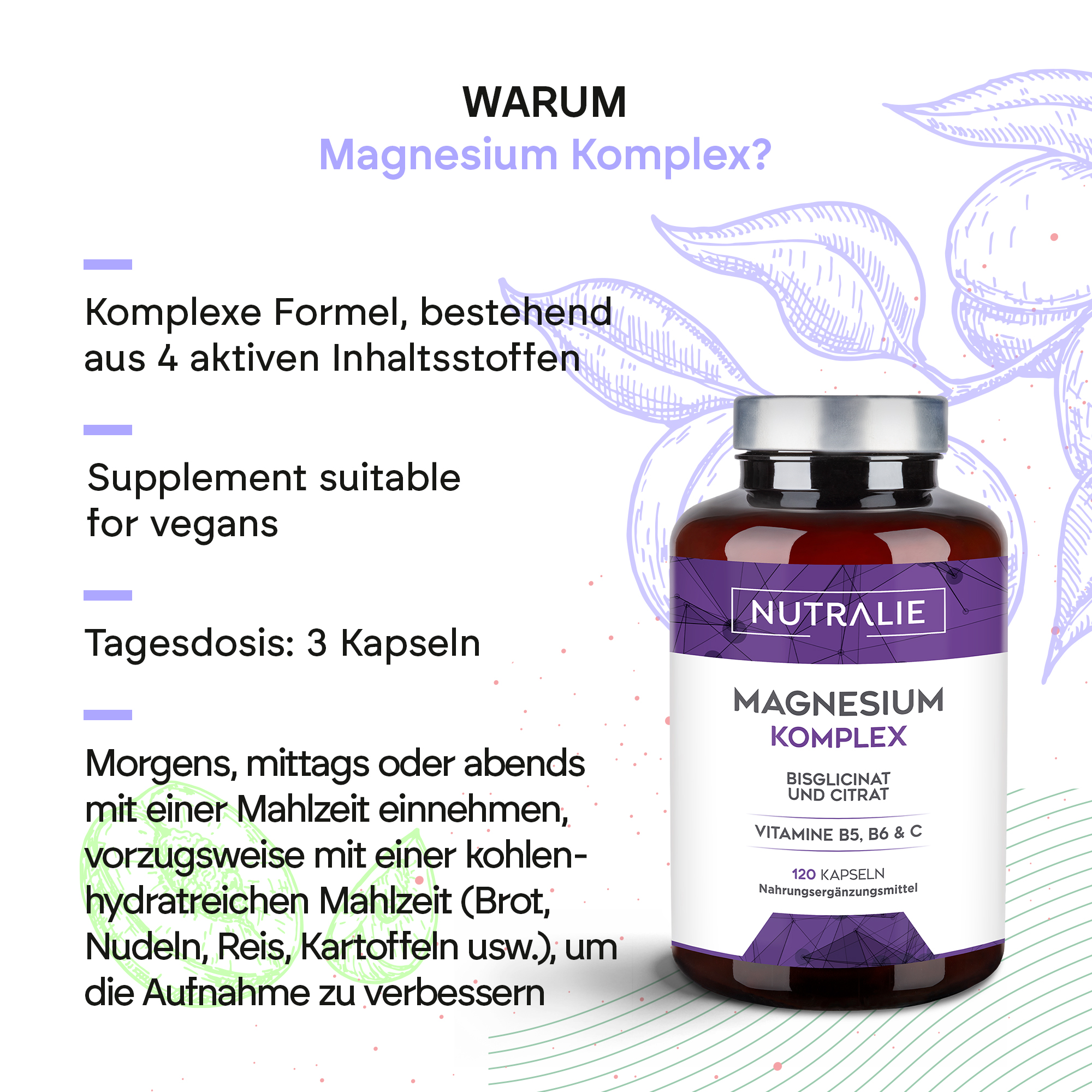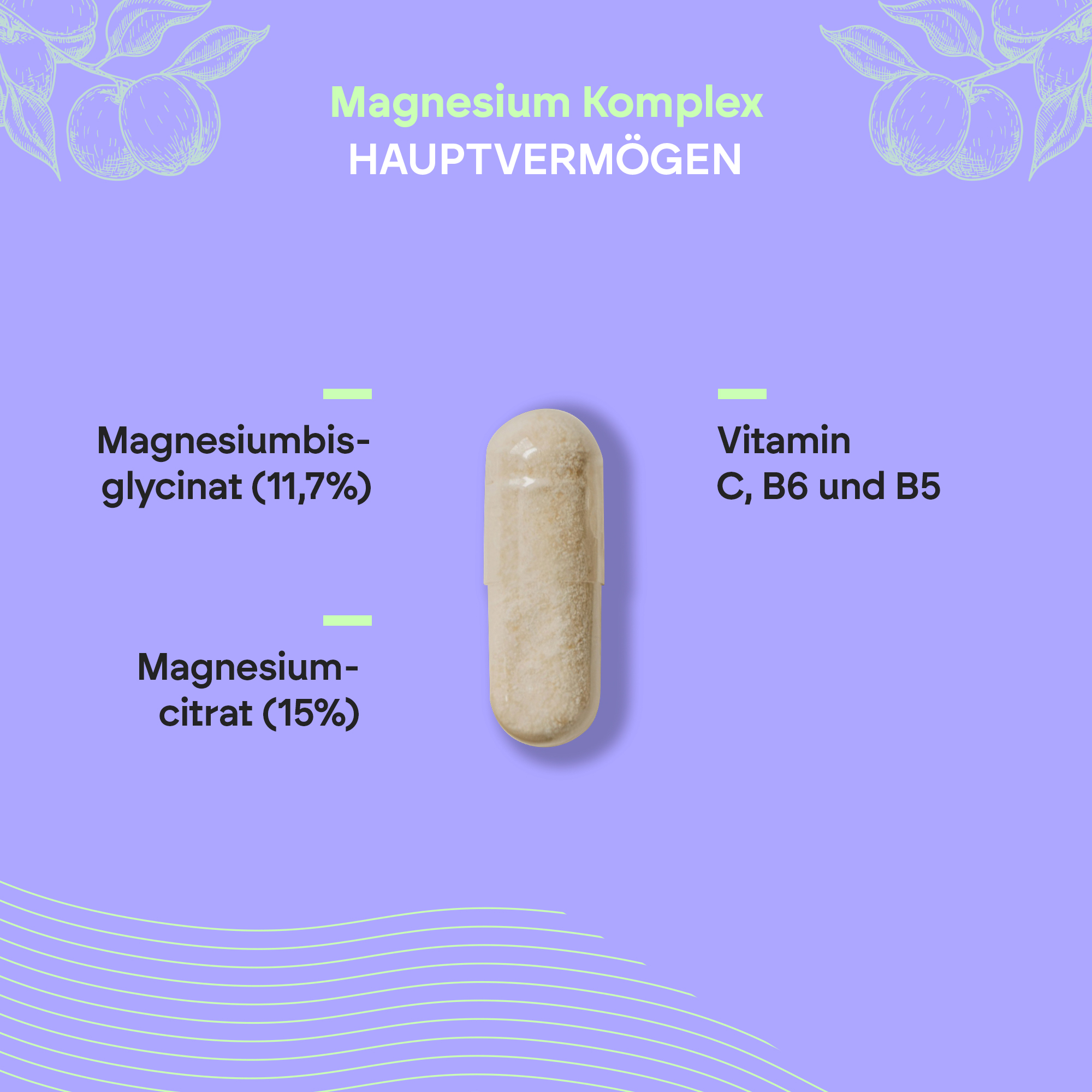 Magnesiumcitrat, Magnesiumbisglycinat, pflanzliche Kapsel: Überzugsmittel (Hydroxypropylmethylcellulose), L-Ascorbinsäure (Vitamin C), Füllstoff (mikrokristalline Cellulose), Trennmittel (Magnesiumsalze der Speisefettsäuren, Siliciumdioxid), Calcium-D-pantothenat (Pantothensäure), Pyridoxinhydrochlorid (Vitamin B6).