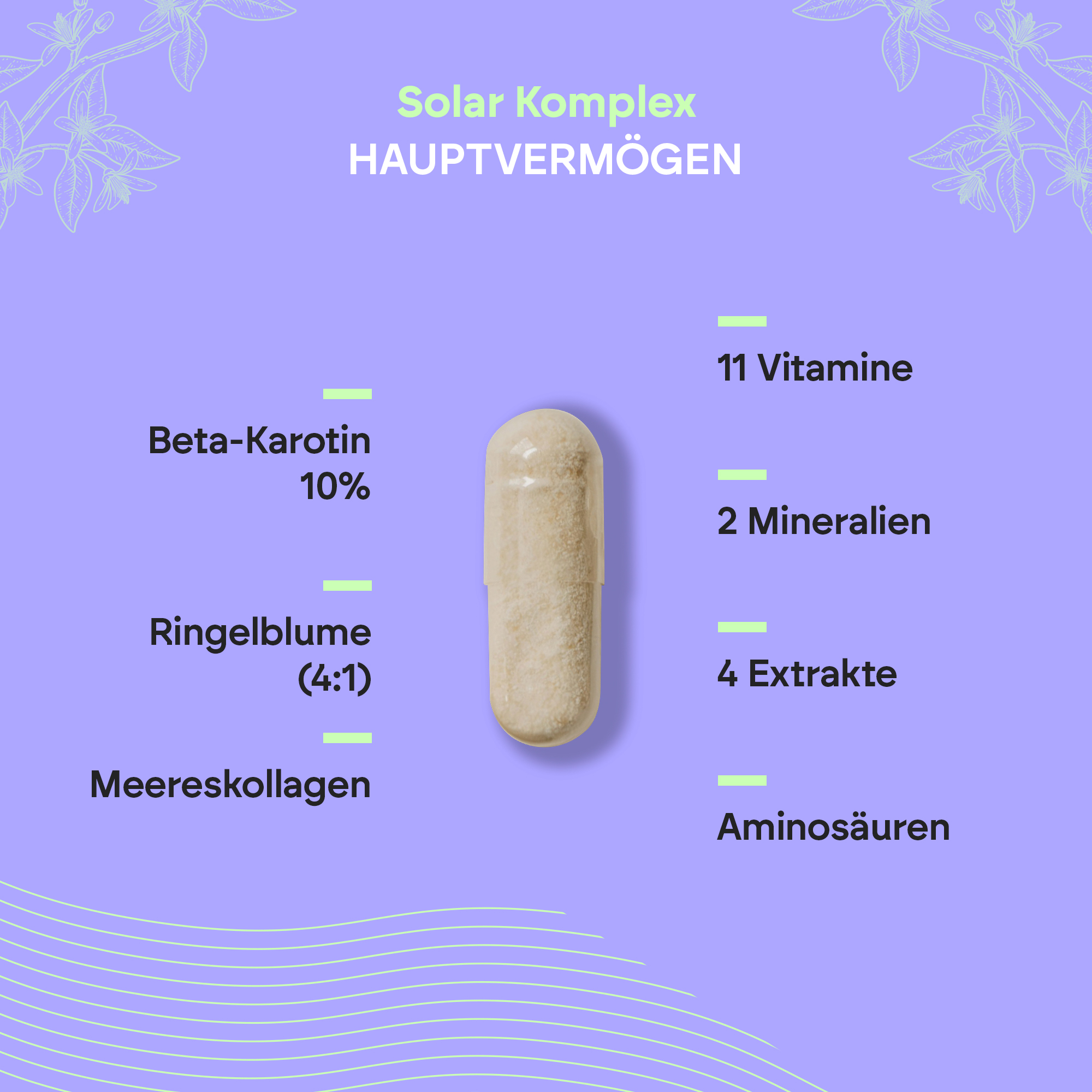 Klettenwurzel- Trockenextrakt (Arctium lappa L.), Kapsel [Überzugsmittel (Hydroxypropylmethylcellulose)], hydrolysiertes Fischkollagen ,Vitamin C (L-Ascorbinsäure), L-Cystein, Kurkuma-Rhizom- Trockenextrakt (Curcuma longa L.), Masson Pinienrinden-Trockenextrakt (Pinus massoniana Lamb.), L-Tyrosin, Calendulablüten-Trockenextrakt (Calendula officinalis L.), Niacin (Nicotinamid), L-Selenomethionin, Pantothensäure (Calcium-D-Pantothenat), Lycopin, Kupfergluconat, Vitamin A (Beta-Carotin), Vitamin D (Cholecalciferol), Trennmittel (Magnesiumsalze von Speisefettsäuren, Silizium Dioxid), Füllstoff (mikrokristalline Cellulose), Vitamin A (Retinylacetat), Vitamin B6 (Pyridoxinhydrochlorid), Thiamin (Thiaminhydrochlorid), Riboflavin (Riboflavin), Vitamin B12 (Methylcobalamin), Folat (Pteroylmonoglutaminsäure), D-Biotin.