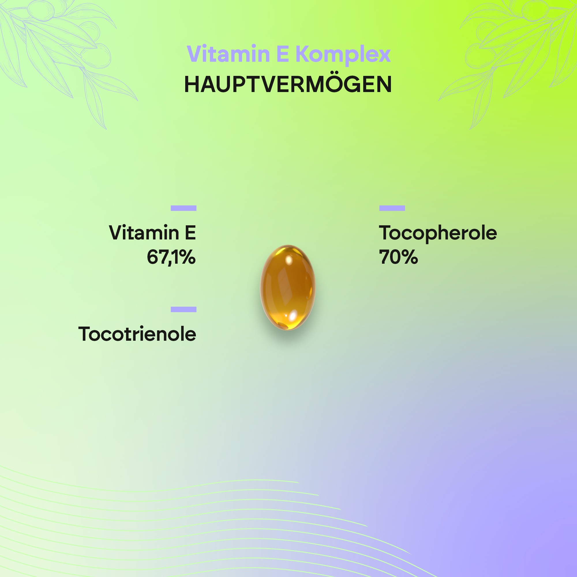 Olivenöl (Trägerstoff), Kapsel (Gelatine, Feuchthaltemittel: pflanzliches Glycerin, Wasser), D-alpha-Tocopherol, gemischte Tocotrienole und Tocopherole 50 %, gemischte Tocopherole 70 %.