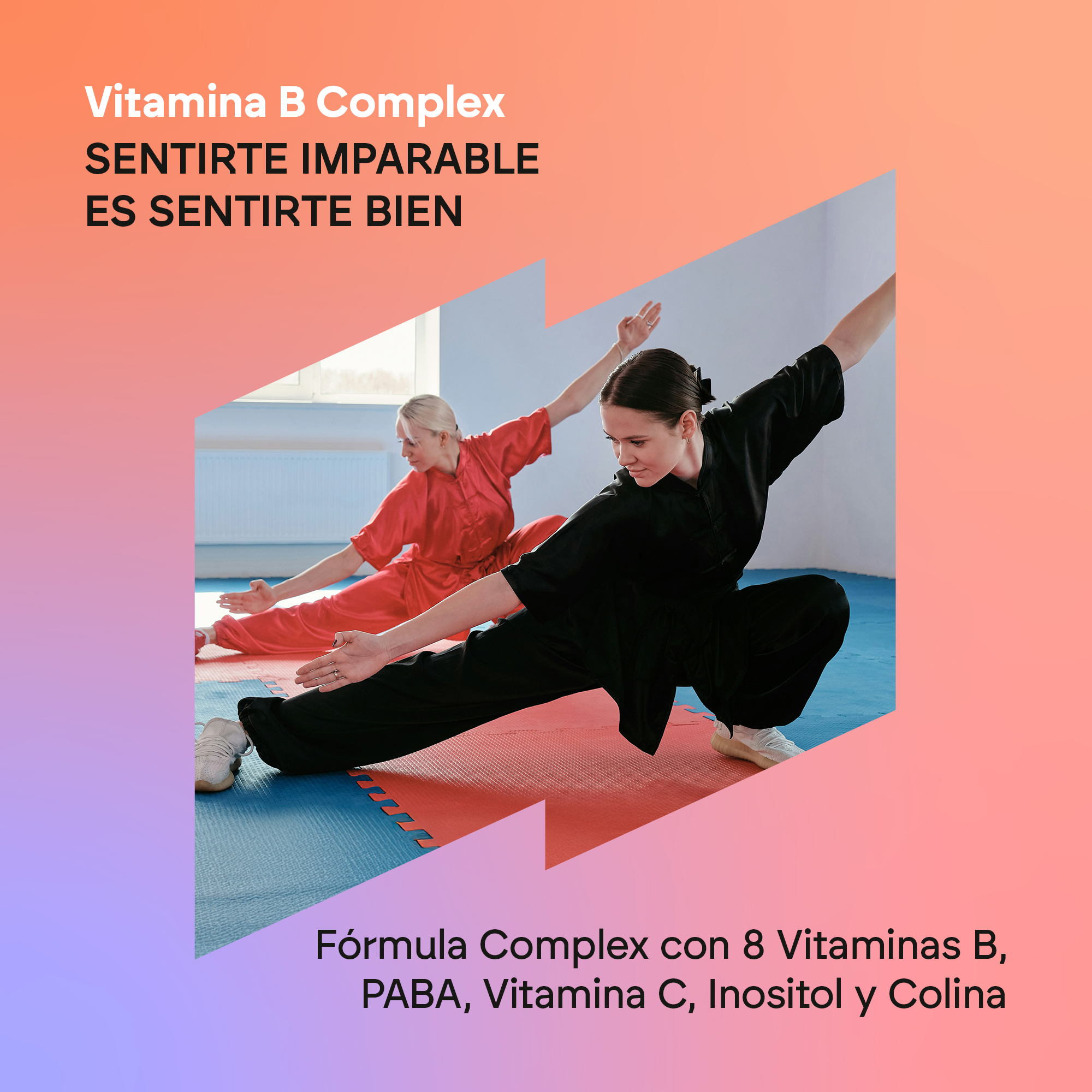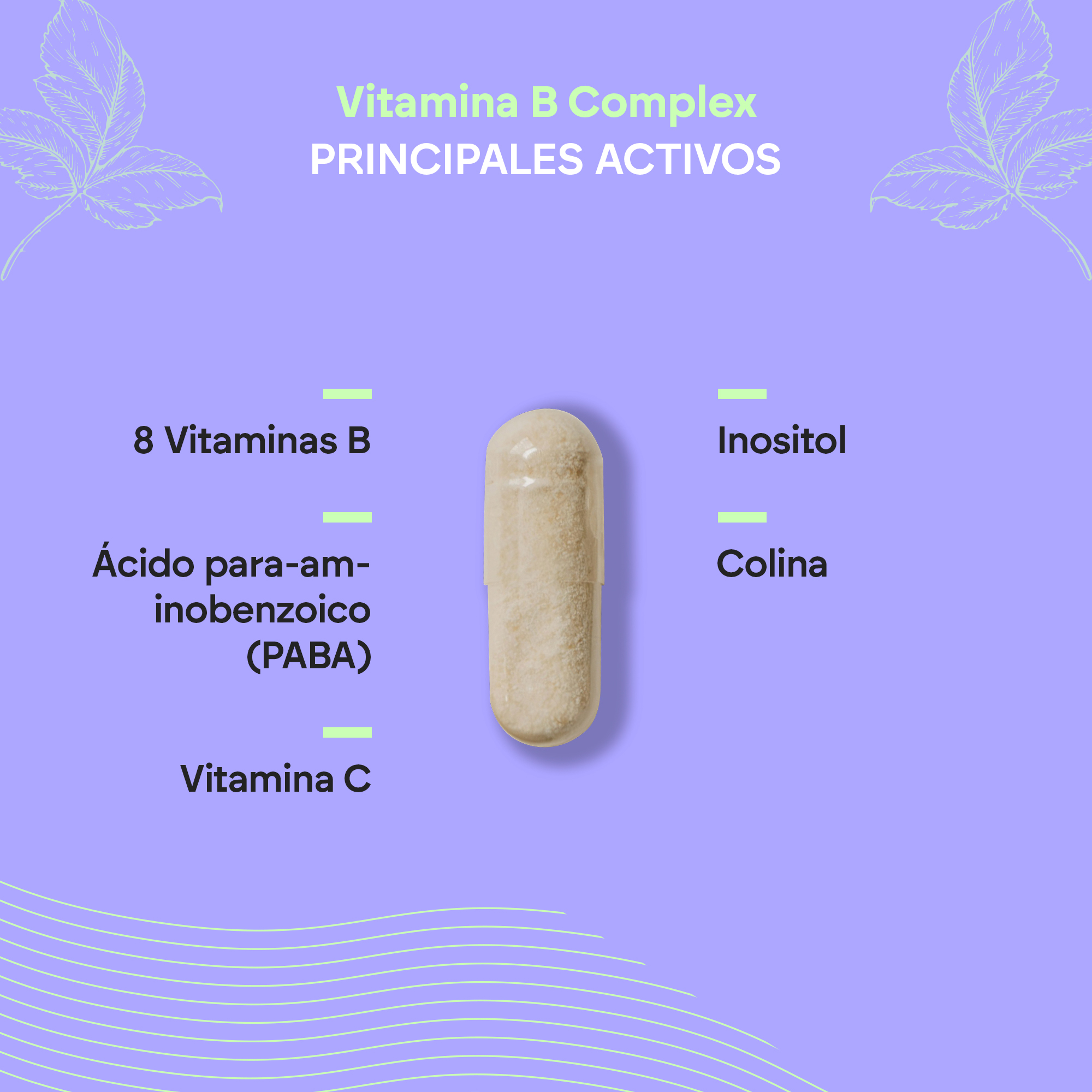Bitartrato de colina, cápsula [agente de recubrimiento (hidroxipropilmetilcelulosa)], agente de carga (celulosa microcristalina), vitamina C (ácido L-ascórbico), inositol, PABA (ácido para-aminobenzoico), niacina (nicotinamida), tiamina (clorhidrato de tiamina), riboflavina (riboflavina), ácido pantoténico (D-pantotenato cálcico), vitamina B6 (clorhidrato de piridoxina), antiaglomerantes (sales magnésicas de ácidos grasos y dióxido de silicio), ácido fólico (ácido pteroilmonoglutámico), biotina (D-biotina), vitamina B12 (cianocobalamina).