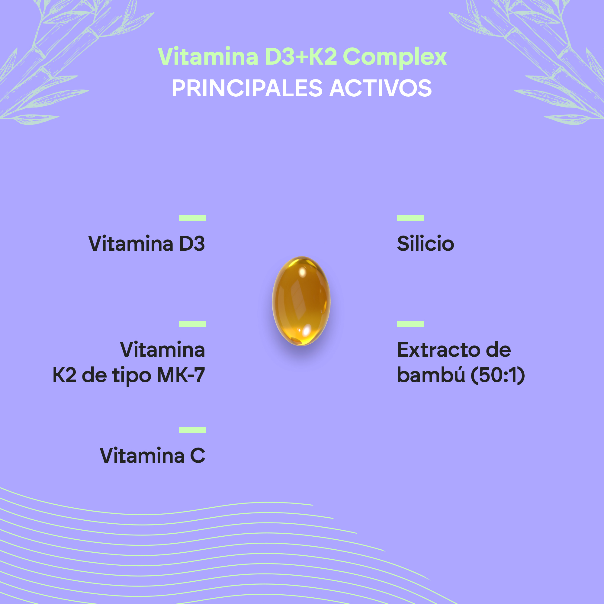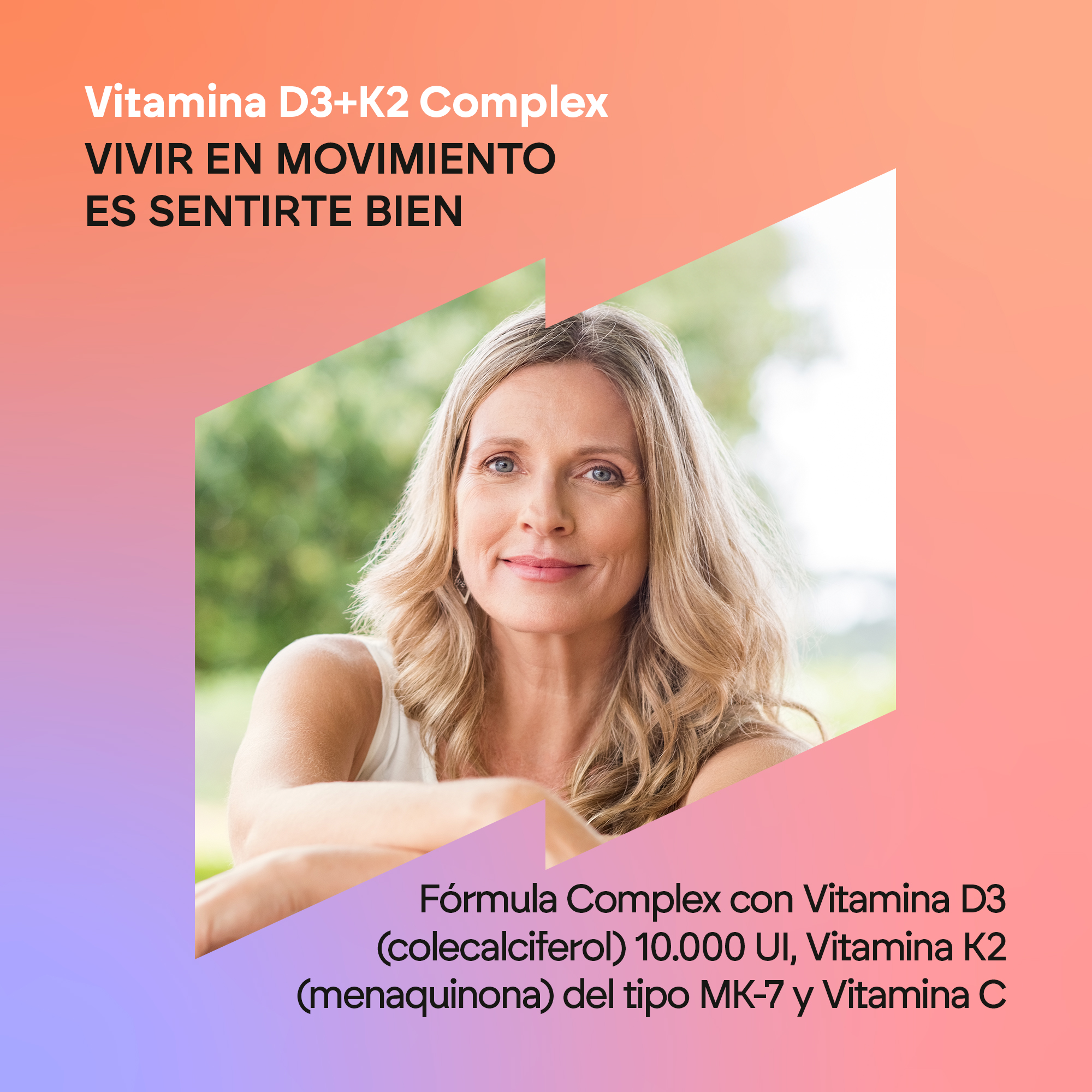 Vitamin D3 + K2 Complex es un suplemento formulado con Vitamina D3 (colecalciferol) 10.000 UI, Vitamina K2 (menaquinona) del tipo MK-7 y Vitamina C.