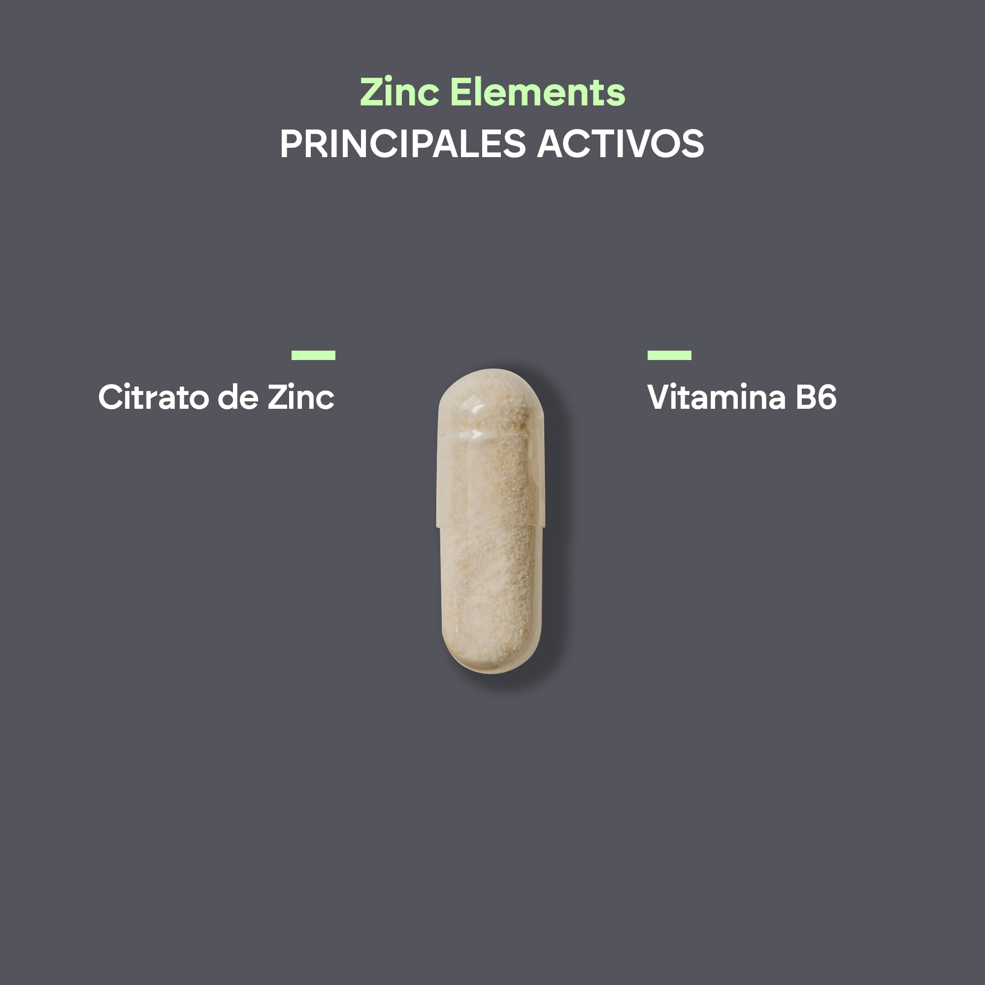Zinc Elements está formulado con una alta dosis de Zinc, que contribuye al metabolismo normal de los macronutrientes y de los ácidos grasos.