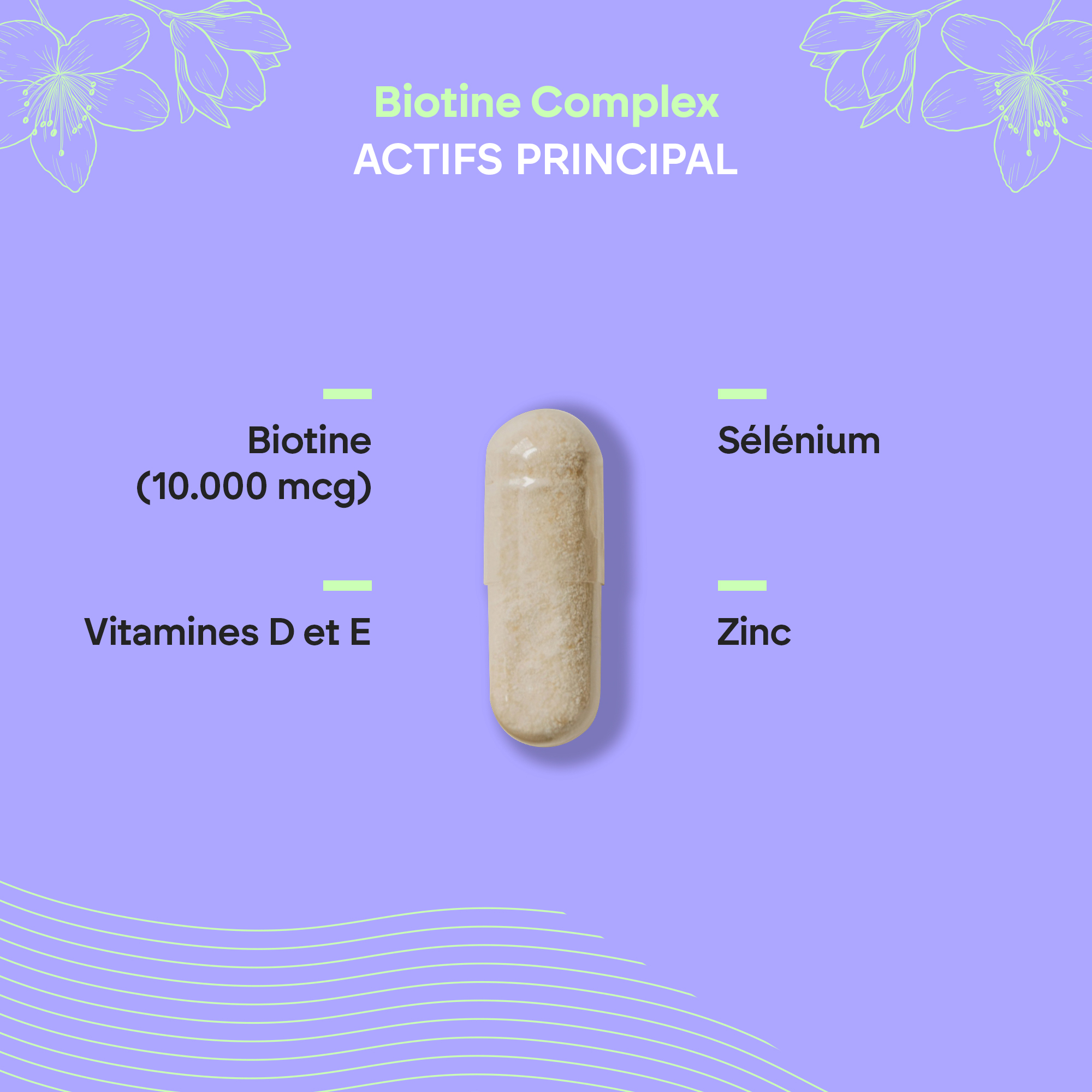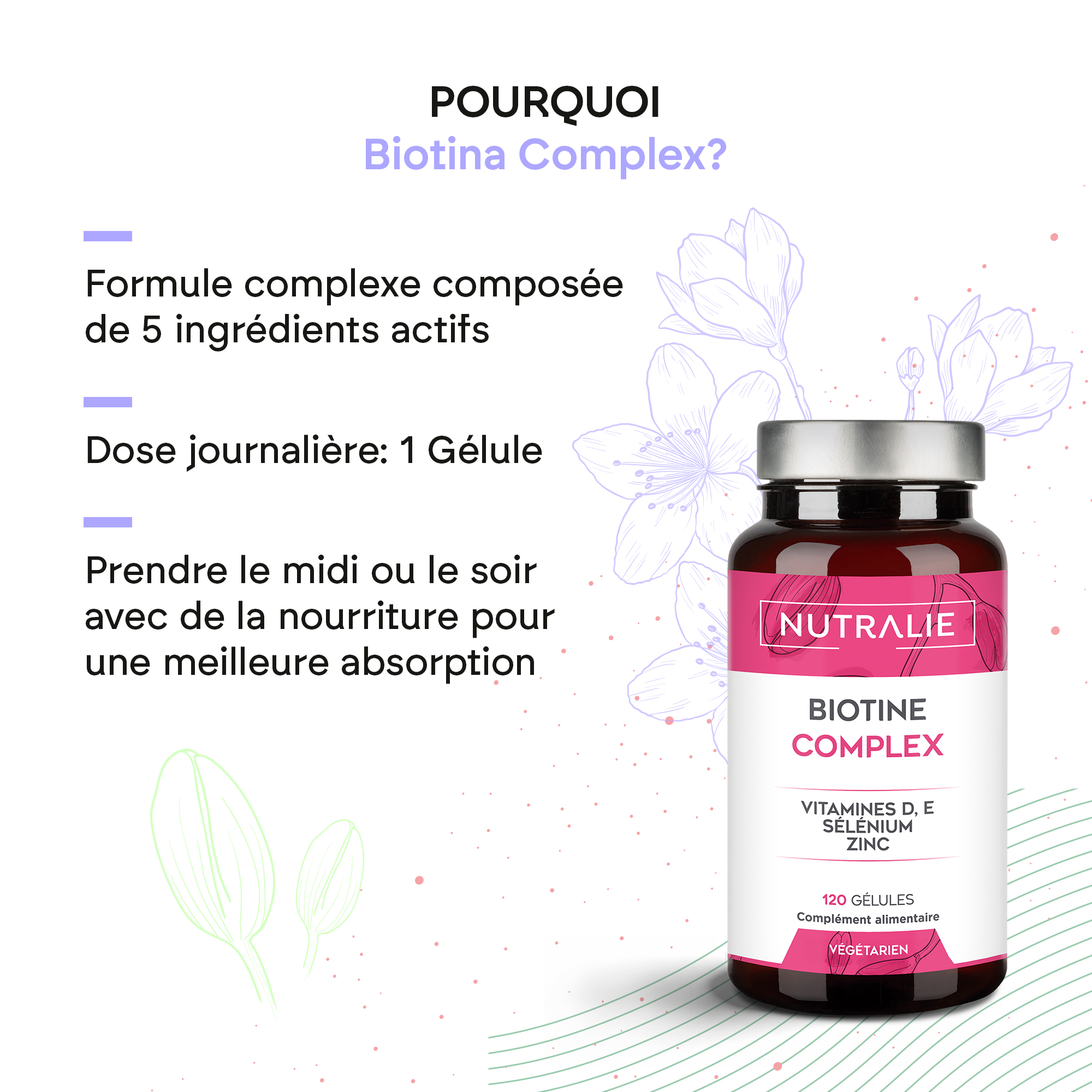 La biotine, le zinc et le sélénium ontribuent au maintien de cheveux normaux.