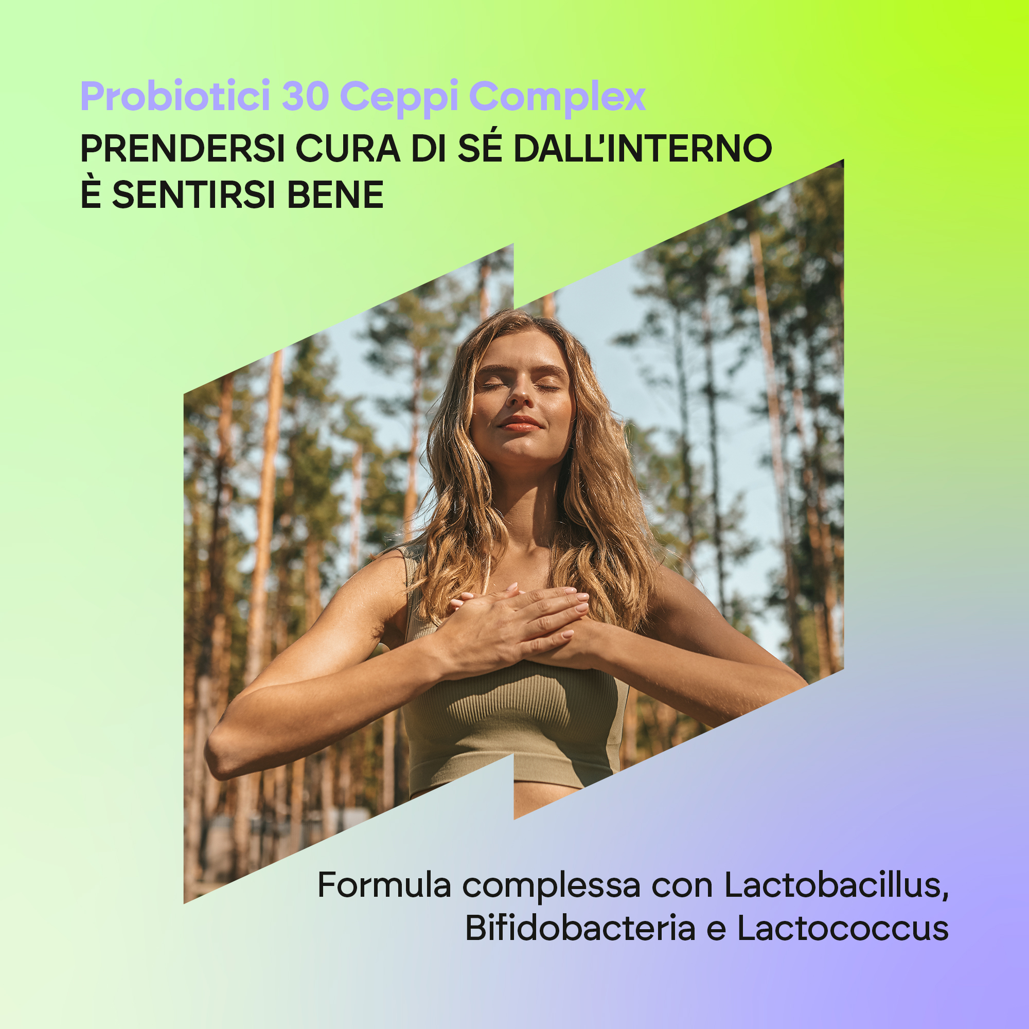 Mix di 30 ceppi (Lactobacillus rhamnosus Lr-G14, Lactobacillus rhamnosus Lr-G18, Lactobacillus acidophilus, Lactobacillus plantarum, Lactobacillus reuteri, Lactobacillus casei, Lactobacillus paracasei, Lactobacillus salivarius, Lactobacillus helveticus, Lactobacillus fermentum,Lactobacillus gasseri, Lactobacillus crispatus, Bifidobacterium bifidum, Bifidobacterium longum, Bifidobacterium breve, Lactobacillus brevis,Lactobacillus amylovorus, Bifidobacterium infantis, Bifidobacterium lactis, Bifidobacterium animalis, Lactobacillus johnsonii, , Lactobacillus sakei, , Lactobacillus bulgaricus, Bifidobacterium adolescentis, Lactococcus lactis, Lactobacillus delbruekii, Leuconostoc mesenteroides, Pediococcus acidilactici, Streptococcus thermophilus, Lactobacillus lactis); inulina, capsula [agente di rivestimento (idrossipropilmetilcellulosa), agente gelificante (gomma di gellano)], agente di carica (cellulosa microcristallina), zinco (citrato di zinco), agenti antiagglomeranti (sali di magnesio degli acidi grassi, biossido di silicio), vitamina D (colecalciferolo).
