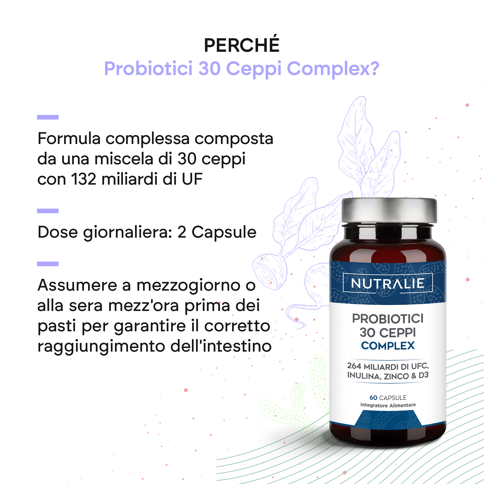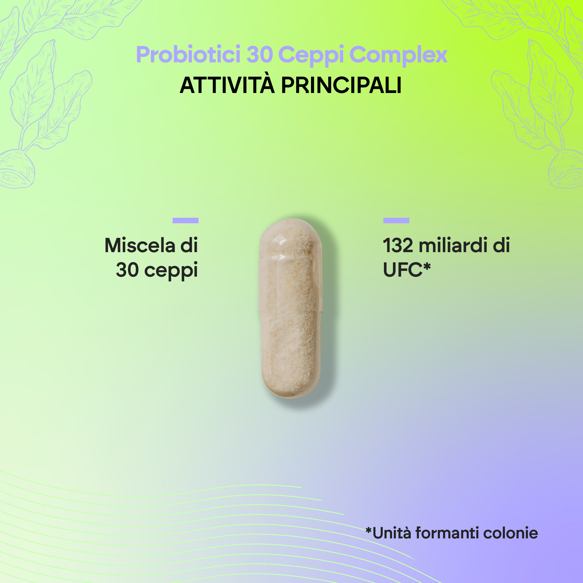 Ogni dose, composta da due capsule, contiene 132 miliardi di UFC (unità formanti colonie) per tutta la durata di conservazione del prodotto.