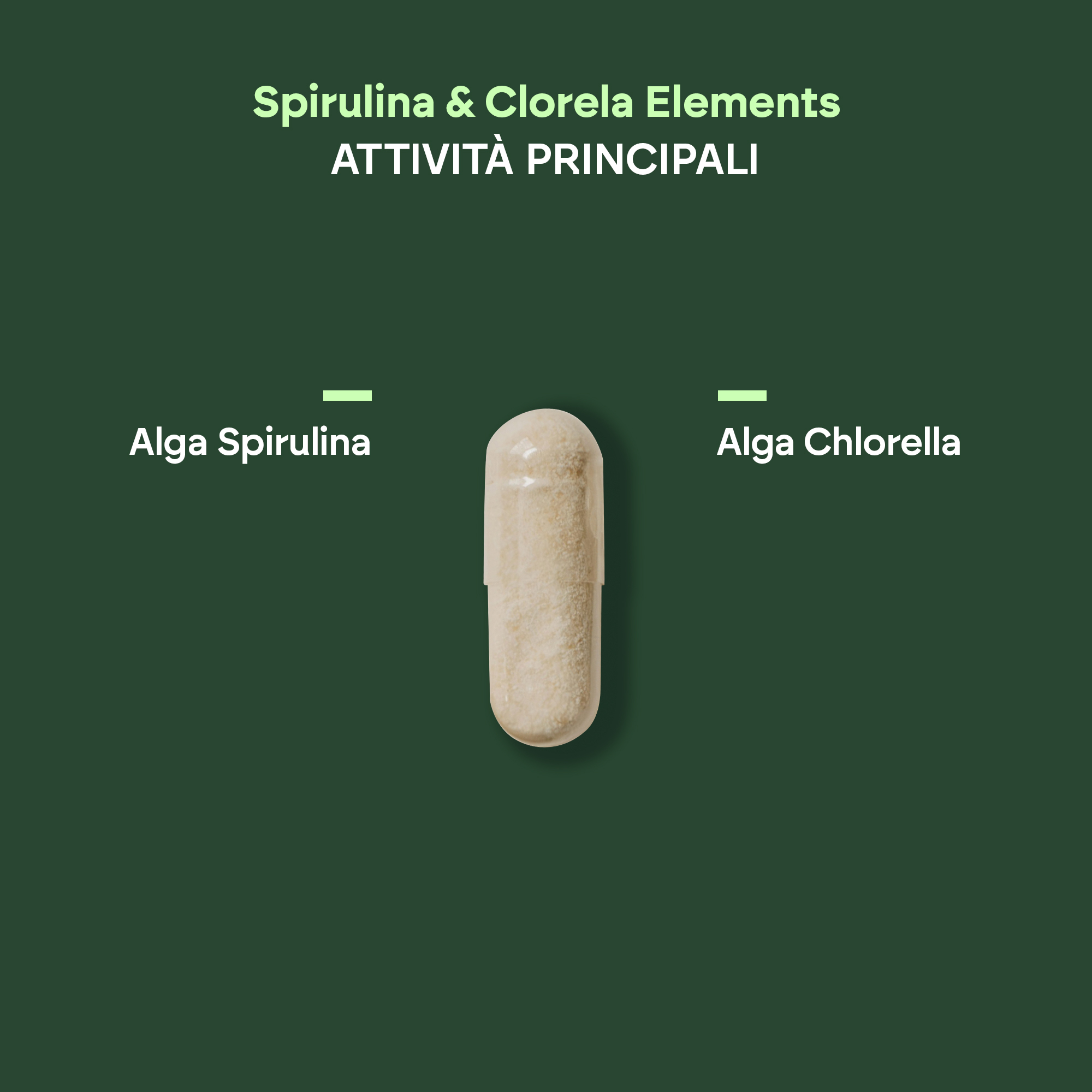 Spirulina & Chlorella Elements è un integratore formulato con alga spirulina (60%) e alga clorella (50%).