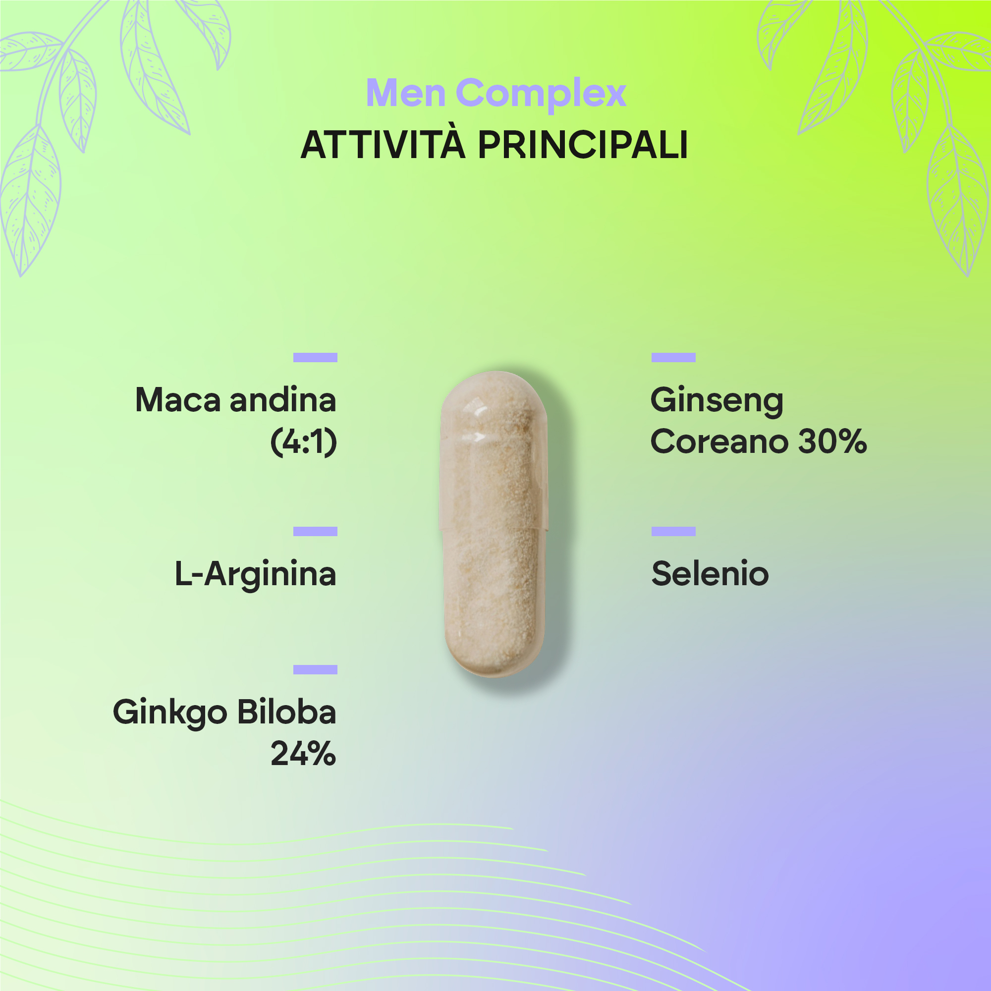 L-arginina, Maca 4: 1 estratto secco (Lepidium meyenii Walp., Root), agente di carica (cellulosa microcristallina), capsula vegetale: agente di rivestimento (idrossipropilmetilcellulosa), ginseng coreano estratto secco (Panax ginseng CA Meyer, radice e foglie, 30 % ginsenosidi), Ginkgo biloba estratto secco (Ginkgo biloba L., foglie, 24% glicosidi flavonoidi), Tribulus terrestris estratto secco (Tribulus terrestris L., frutto, 40% saponine), Antiagglomerante (stearato di magnesio), citrato di zinco, antiagglomerante (biossido di silicio), selenito di sodio.