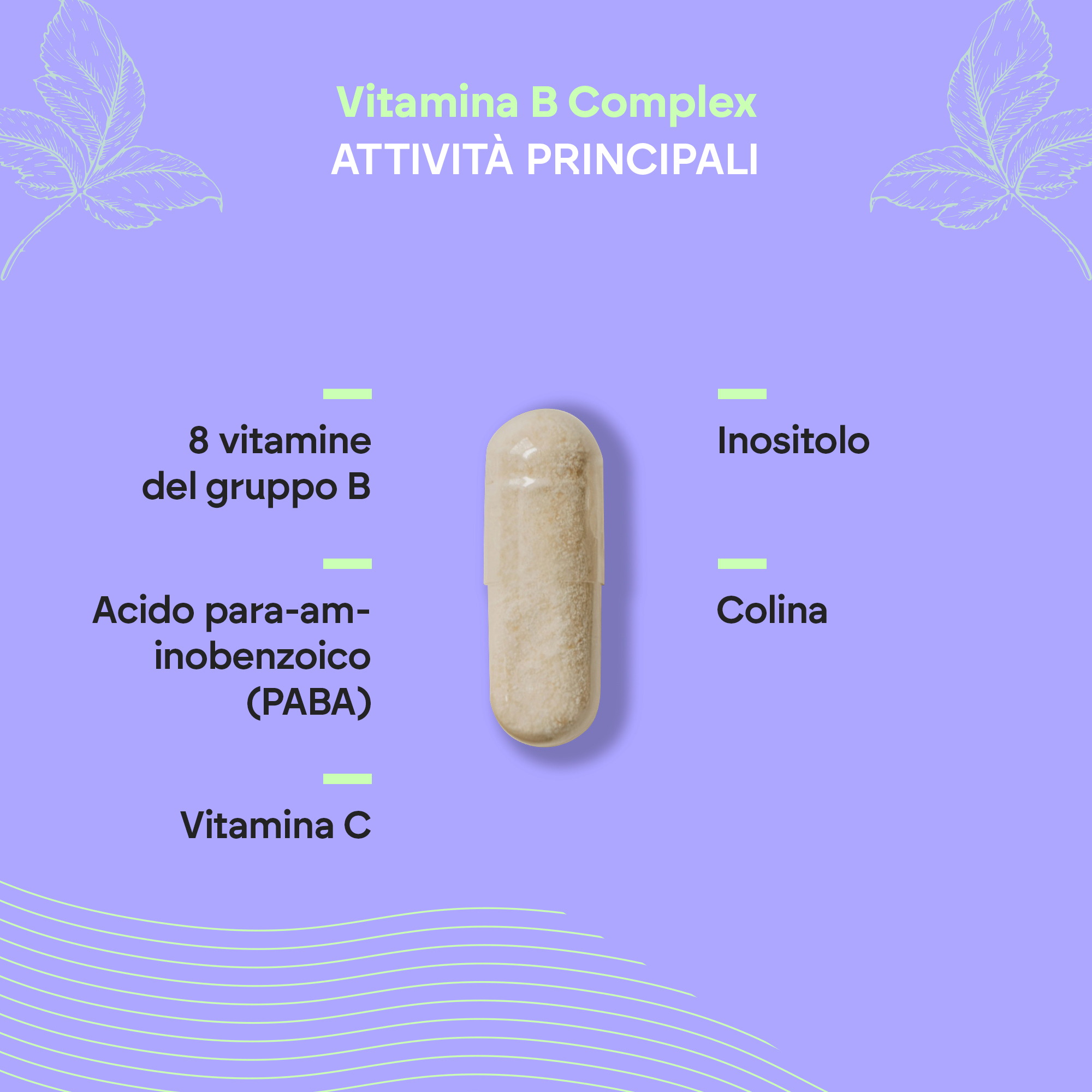 Bitartrato di colina, capsula [agente di rivestimento (idrossipropilmetilcellulosa)], agente di carica (cellulosa microcristallina), vitamina C (acido L-ascorbico), inositolo, PABA (acido para-amminobenzoico), niacina (nicotinammide), tiamina (cloridrato di tiamina), riboflavina (riboflavina), acido pantotenico (D-pantotenato, calcio), vitamina B6 (cloridrato di piridossina), agenti antiagglomeranti (sali di magnesio degli acidi grassi e biossido di silicio), acido folico (acido pteroilmonoglutammico), biotina (D-biotina), vitamina B12 (cianocobalamina).