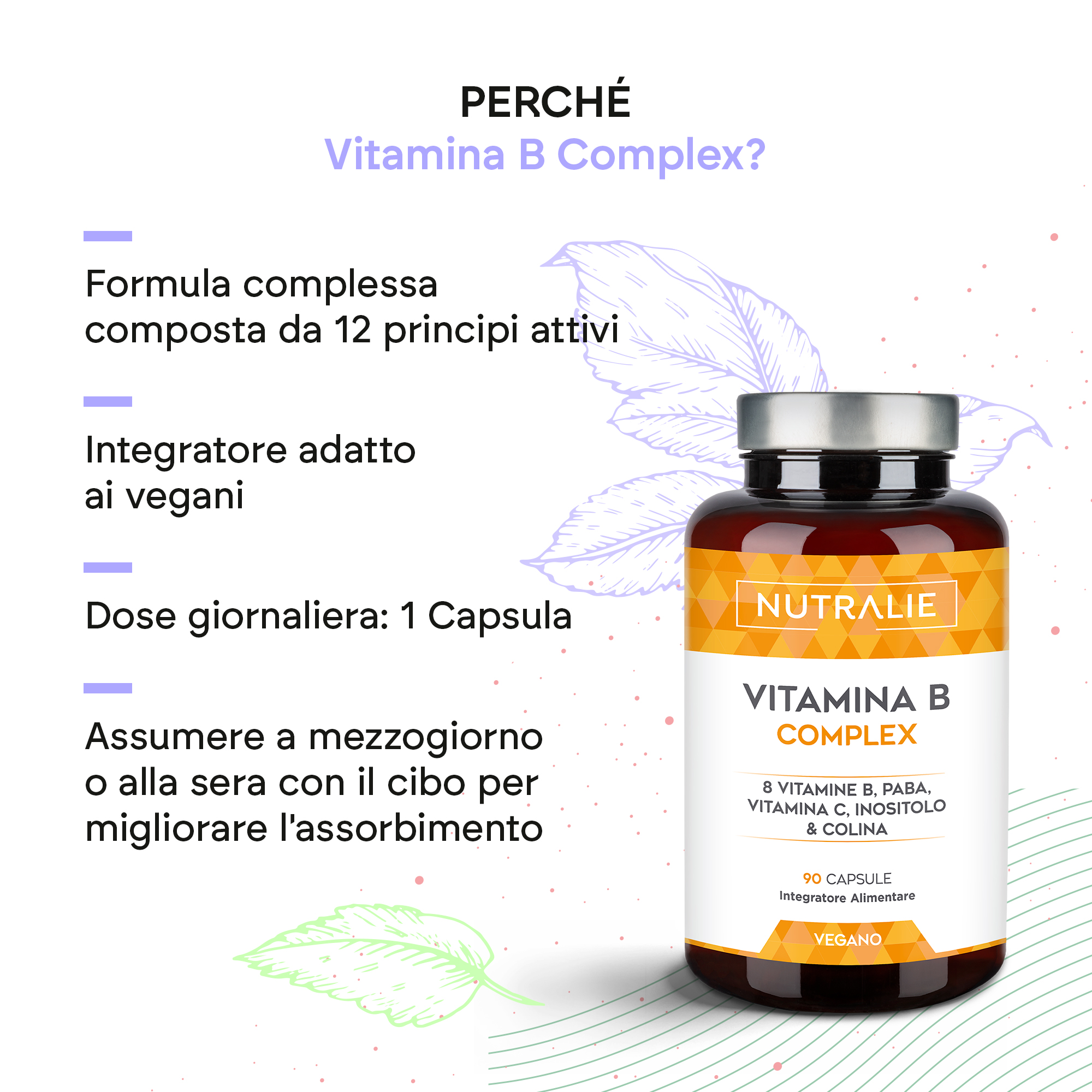 Il complesso vitaminico B di Nutralie contiene vitamina B6, B12 e vitamina C, che aiutano a ridurre la stanchezza e l’affaticamento