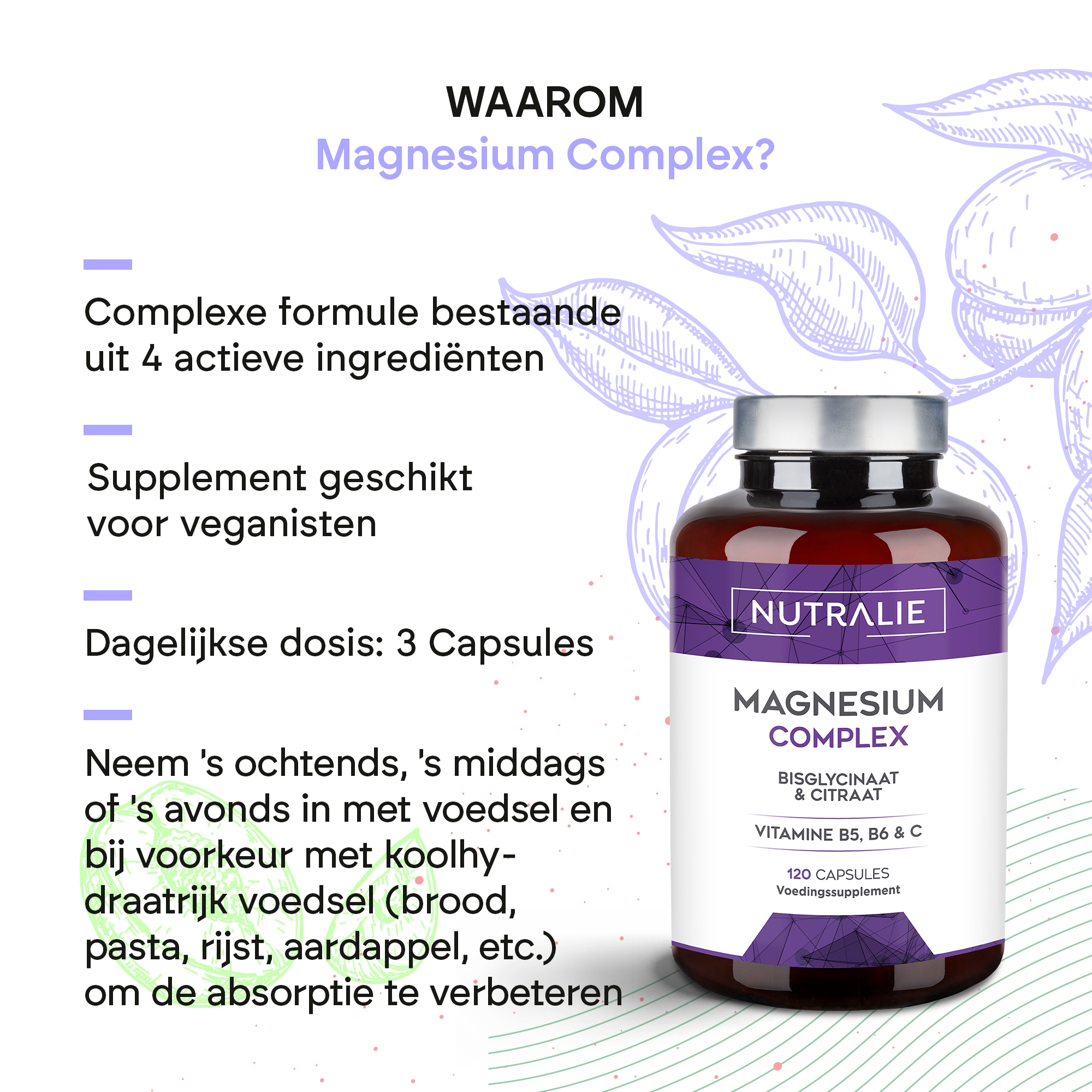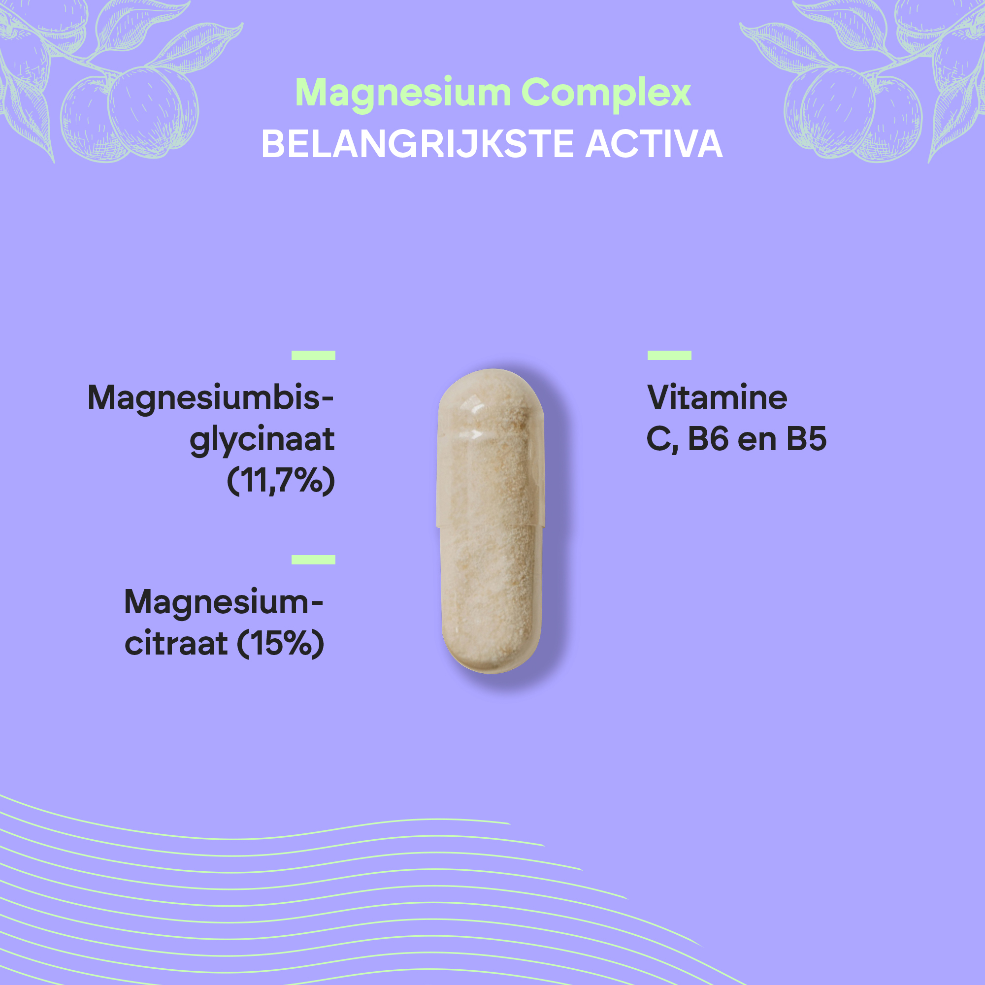 Magnesiumcitraat, magnesiumbisglycinaat, plantaardige capsule: Glansmiddel (hydroxypropylmethylcellulose), L-ascorbinezuur (vitamine C), vulstof (microkristallijne cellulose), antiklontermiddelen (magnesiumzouten van vetzuren, dioxide van silicium), calcium-D-pantothenaat (pantotheenzuur), pyridoxinehydrochloride (vitamine B6).