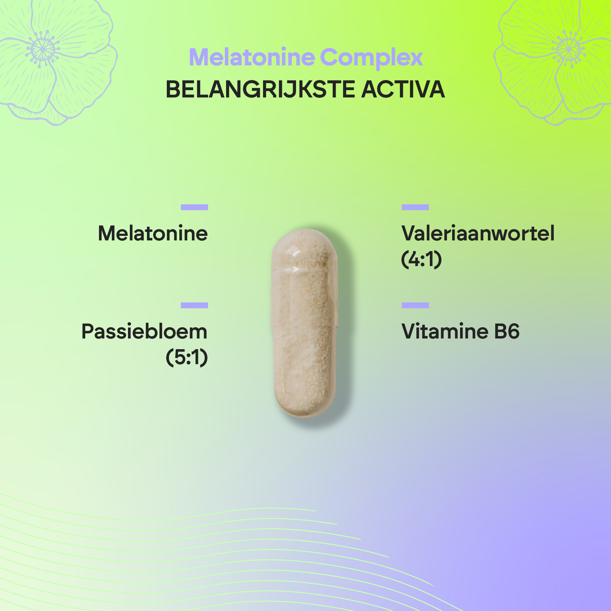 Droog extract California Poppy (Eschschscholtzia californica Cham., luchtgedeelte), droog extract Passiflora (Passiflora Incarnata L., luchtgedeelte), droog extract Melissa (Melissa officinalis L. leaf), capsule: glansmiddel (Hydroxypropylmethylcellulose), droog extract Lindebloesem (Tilia platyphyllos Scop.., bloem), droog extract Valeriana (Valeriana officinalis L., wortel), vulstof (microkristallijne cellulose), antiklontermiddelen (magnesiumstearaat en siliciumdioxide), Melatonine, pyridoxinehydrochloride (vitamine B6). Capsule: glansmiddel (Hydroxypropylmethylcellulose).