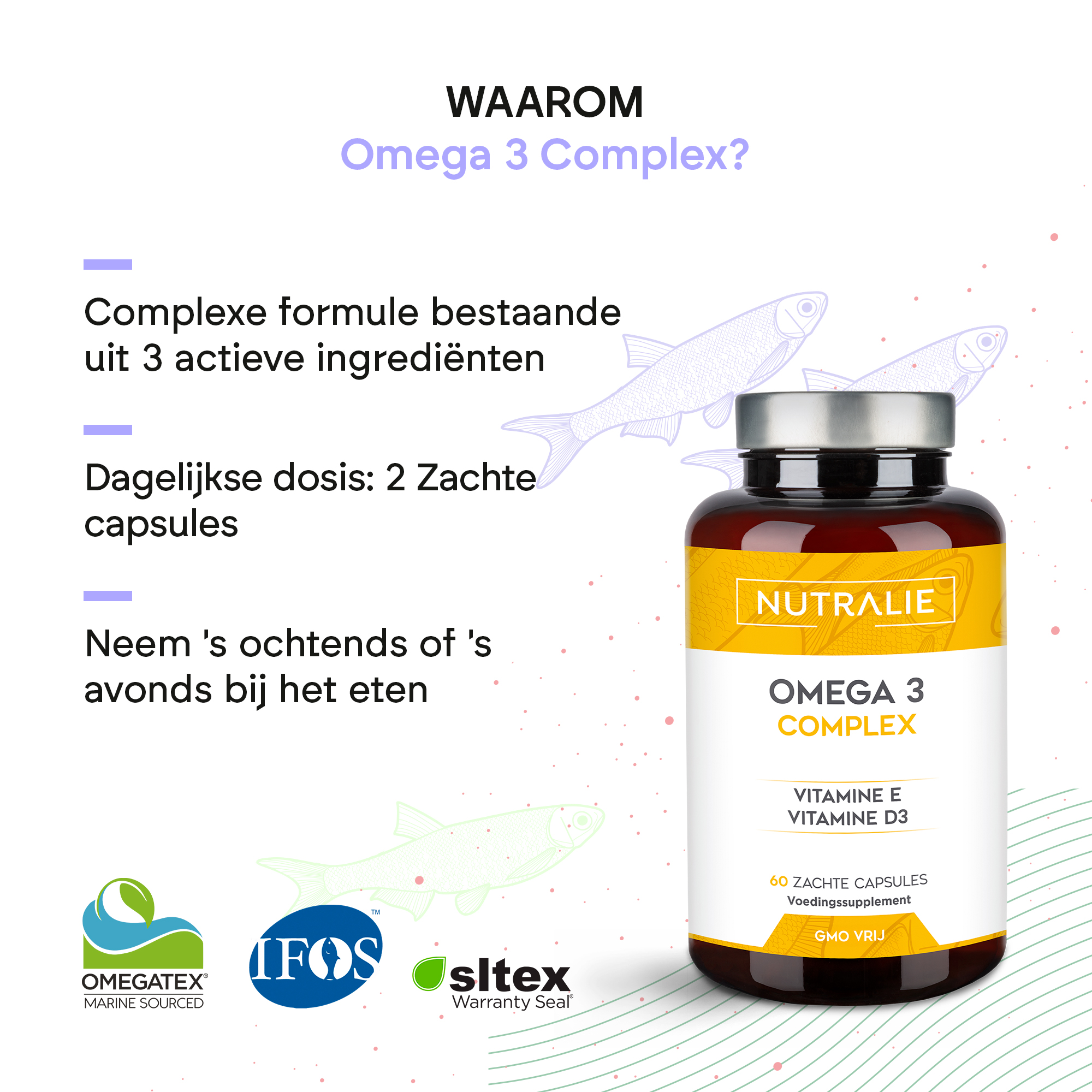 Nutralie’s Omega-3 Complex bevat eicosapentaeenzuur en docosahexaeenzuur, die bijdragen aan een normale hartfunctie. Dit gunstige effect wordt bereikt met een dagelijkse inname van 250 mg EPA en DHA.