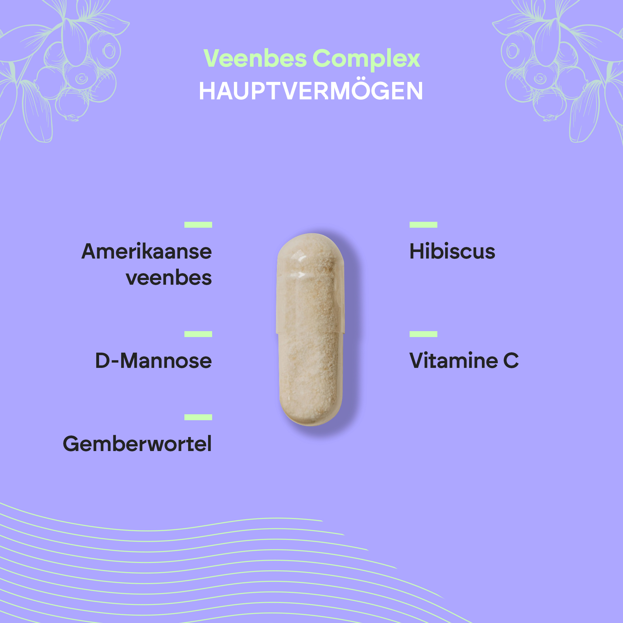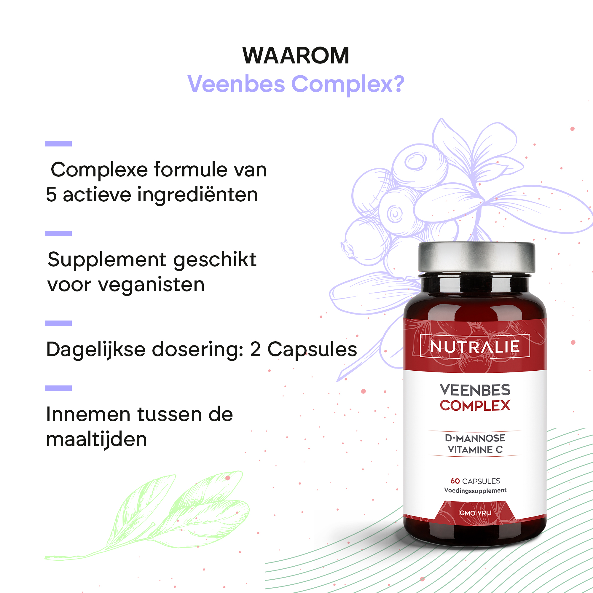 Ons Cranberry Complex bevat ook 80 mg vitamine C, 400 mg D-mannose en 100 mg hibiscus.